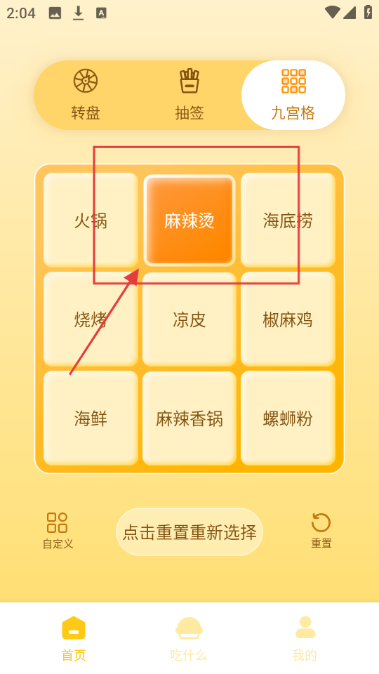 4、九宫格选择结束后,【麻辣烫】选项被选中,可依据此结果安排饮食。