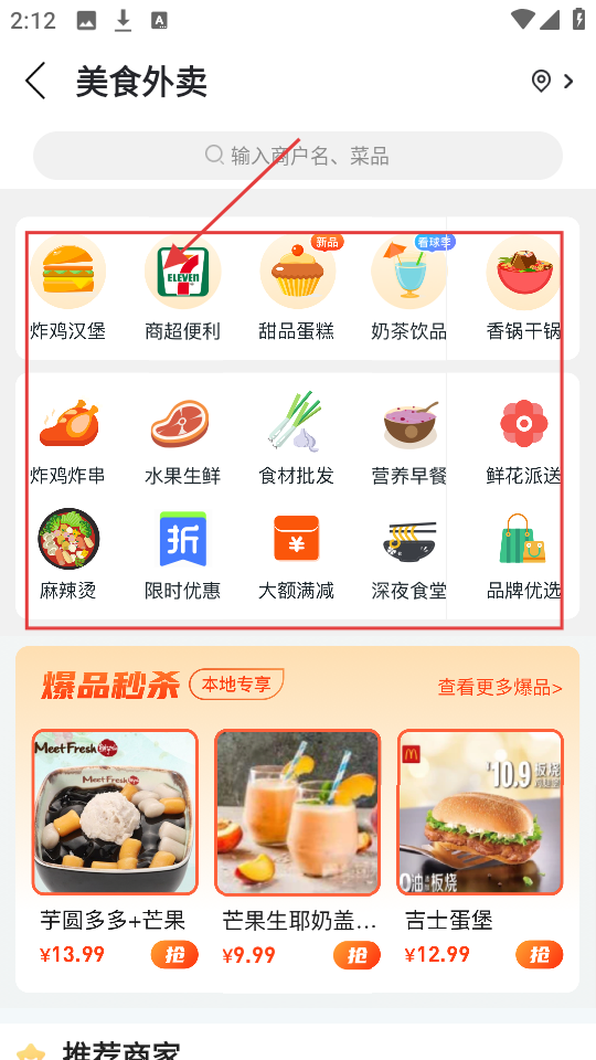 2、在美食外卖页,有炸鸡汉堡、商超便利等分类,选想吃的分类,浏览相关美食。