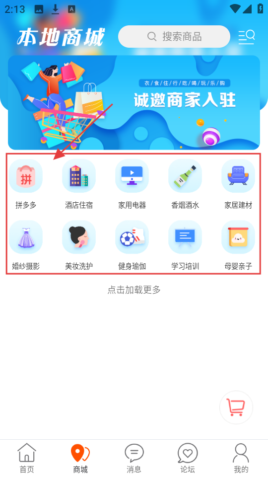 3、到本地商城页,有拼多多、酒店住宿等分类,选需要的分类,查看相关商品或服务。