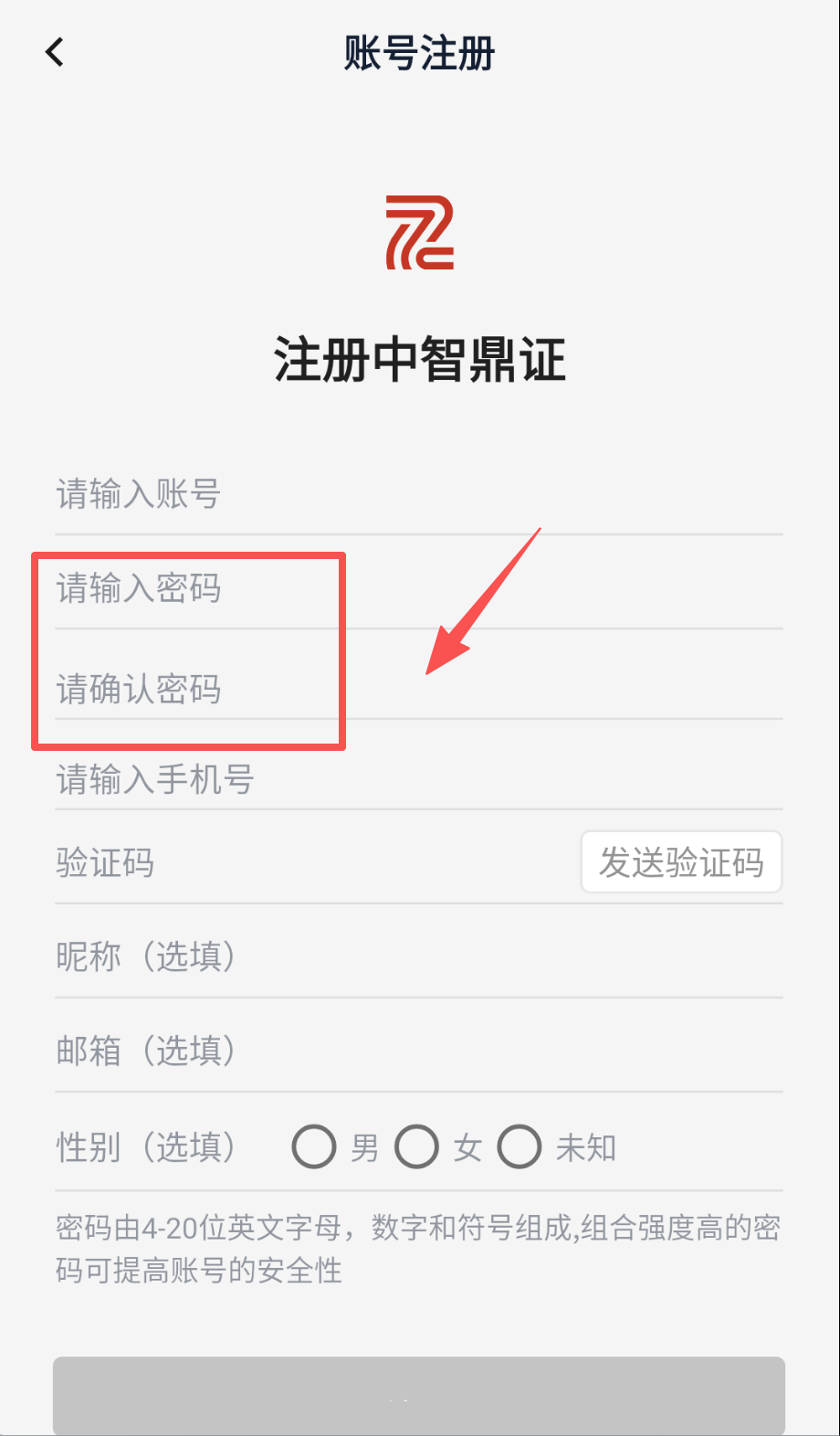 2、 接着设置密码呢,在"请输入密码"和"请确认密码"两栏输入4-20位组合密码,包含字母、数字和符号更安全,输完记得核对一遍别出错。