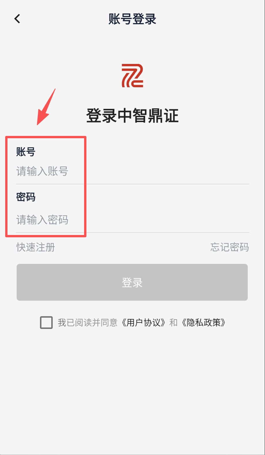 1、 打开软件进入登录页啦,点击"快速注册"跳转至账号注册界面,在"请输入账号"栏填写好记的账号名称,注意别和其他人重复哟。