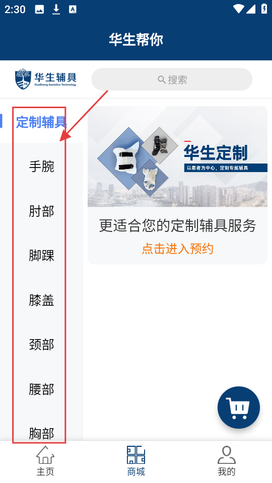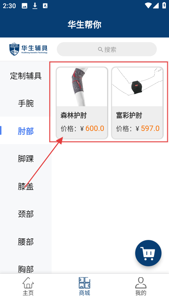 1、在主页,有定制辅具的手腕、肘部等部位分类,选需要的部位,如【肘部】,进入对应辅具页。