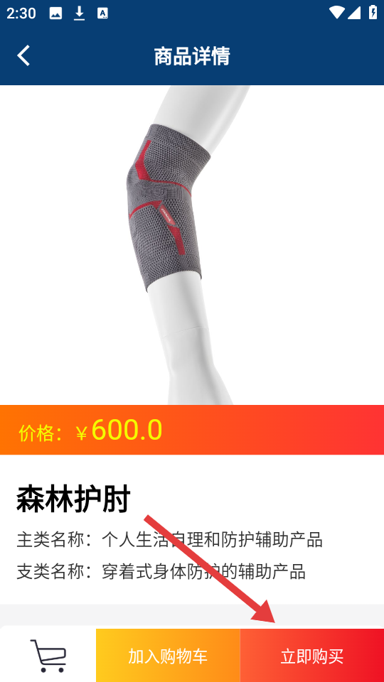 2、在肘部辅具页,有森林护肘、富彩护肘等商品,选【森林护肘】,进入商品详情页。
