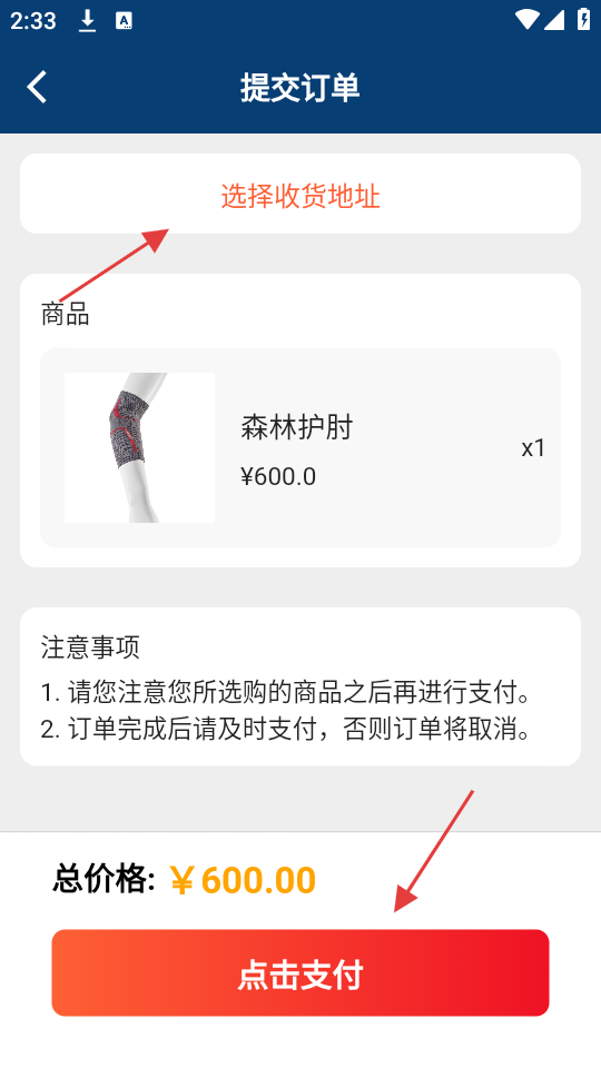 4、在提交订单页,选好收货地址,确认商品信息无误后,点【点击支付】,完成购买流程。