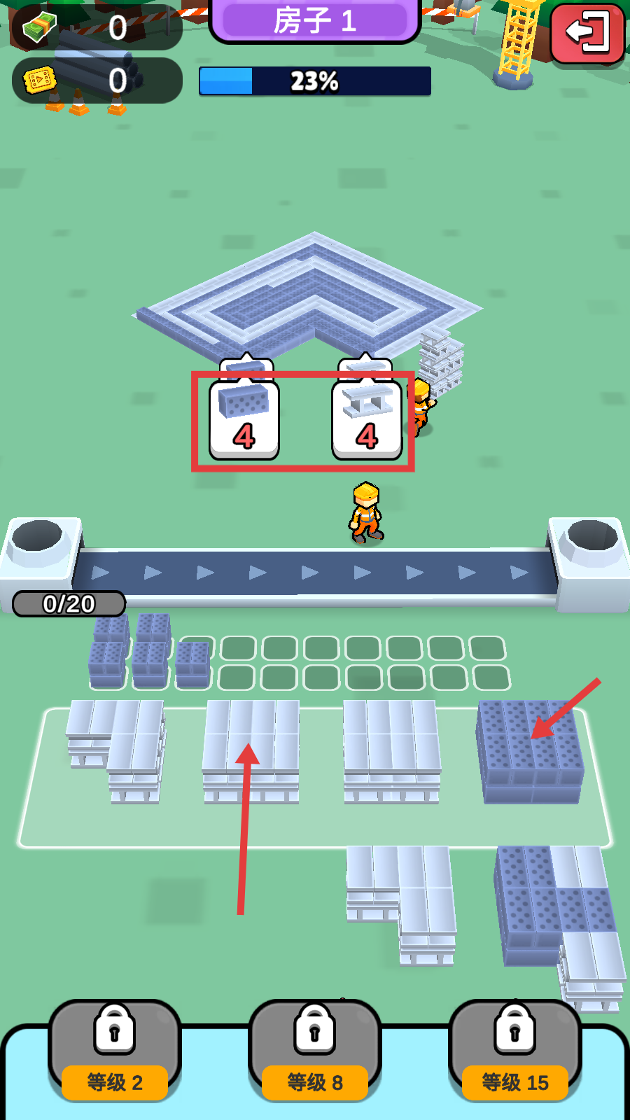 2、进入【房子1】建造界面,利用现有的【4】块砖块、【4】个建材,将对应材料拖到建造区域,推进施工。