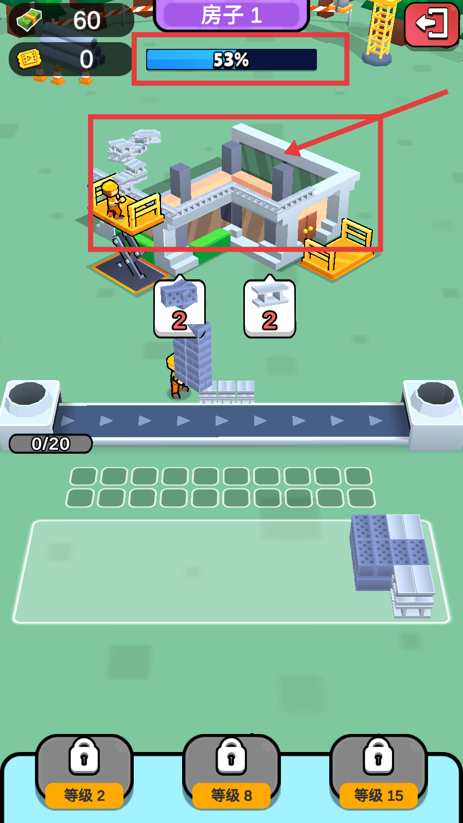 3、持续使用建材,随着建造进度到【53%】,房子结构逐步成型,继续投放剩余材料来加快进度。