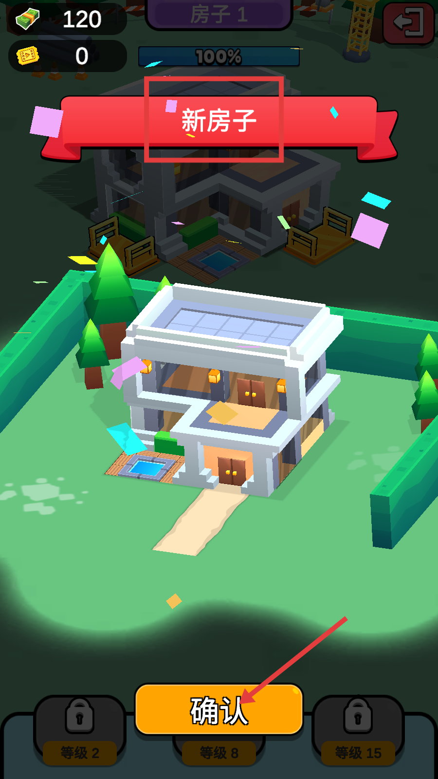 4、当建造进度达100%,会显示【新房子】横幅,此时点击下方【确认】按钮,完成新房子的建造。