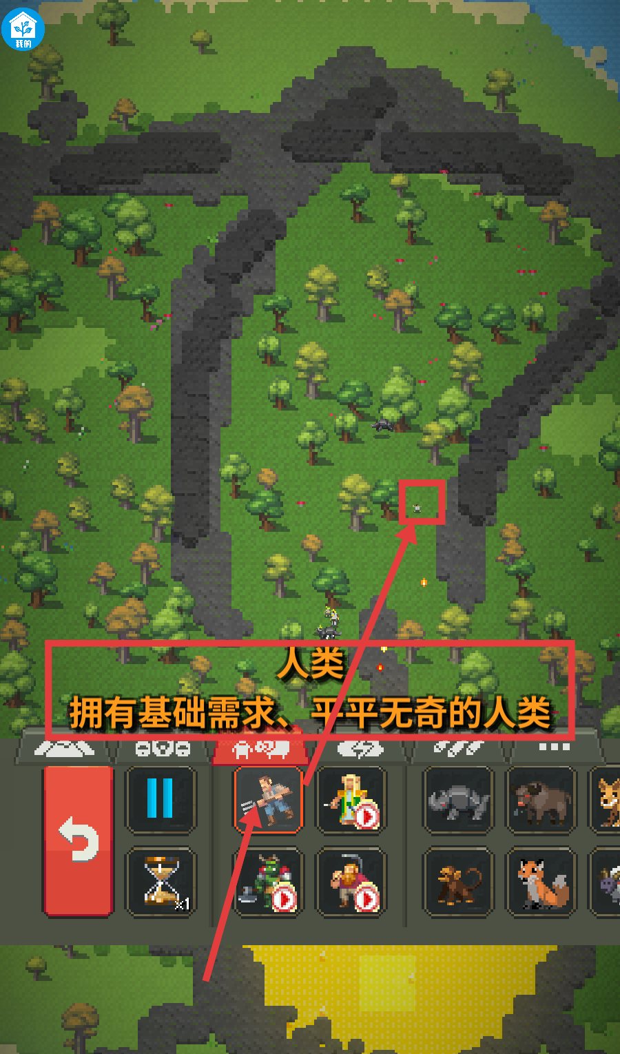 2、选择【人类】单位放置到森林区域,这类“拥有基础需求、平平无奇的人类”会在该区域开展活动。