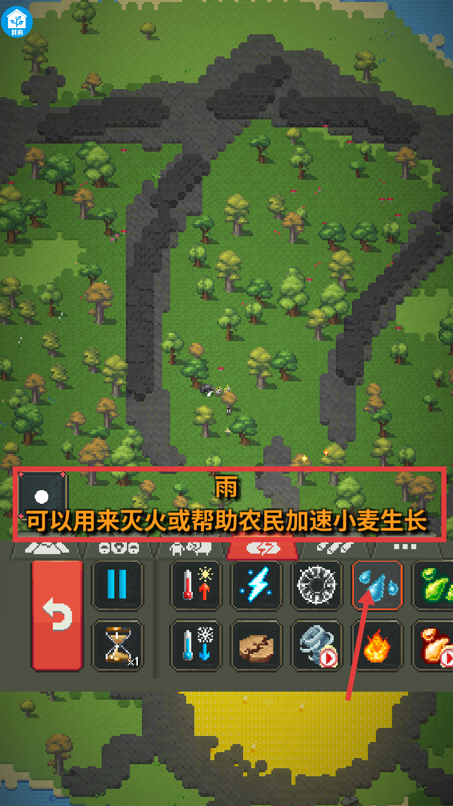 3、使用【雨】技能,它“可以用来灭火或帮助农民加速小麦生长”,对场景进行干预,助力发展。