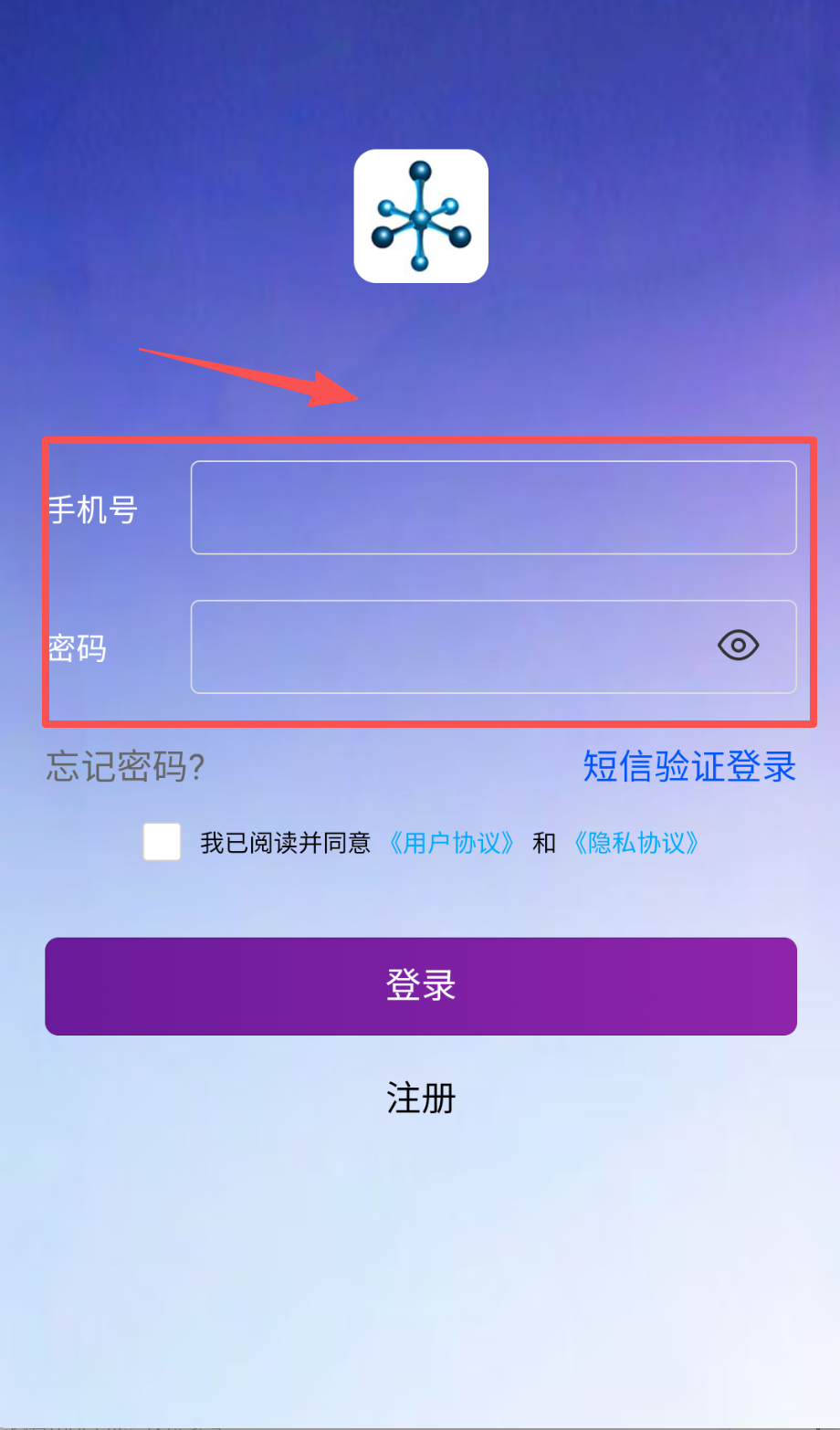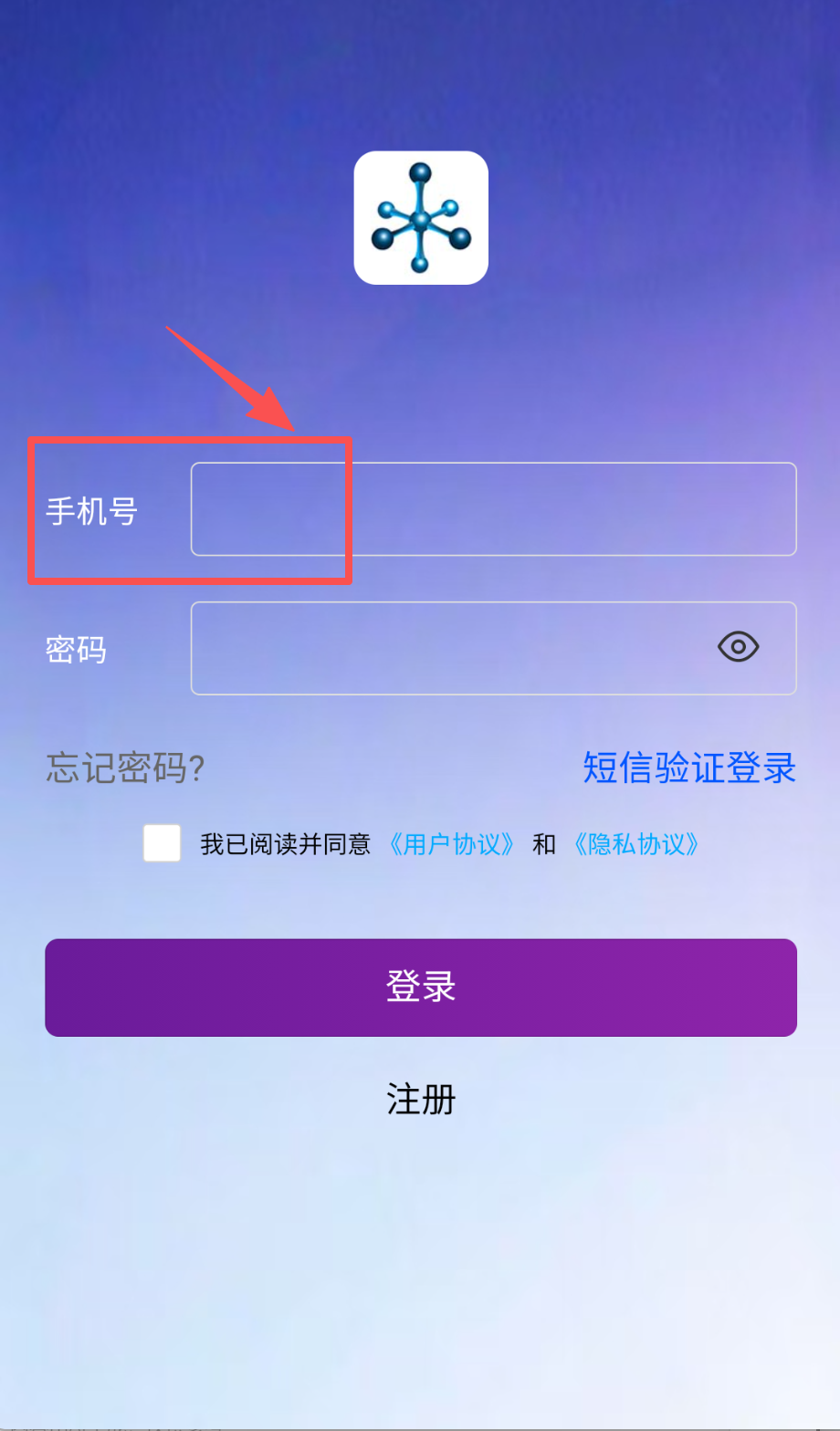 3、 登录时在登录界面输入你的手机号,然后在“密码”框输入注册时设置的密码。确认信息无误并勾选同意用户协议和隐私政策后。