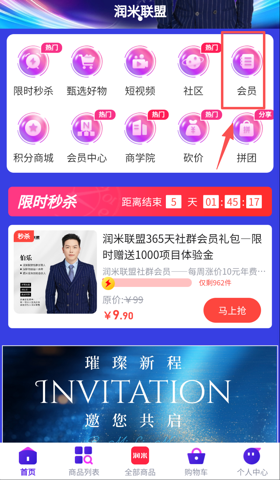 4、 参与平台活动获取积分,进入积分商城兑换实体礼品、课程券等奖励,支持积分转让功能,实现会员间资源共享。