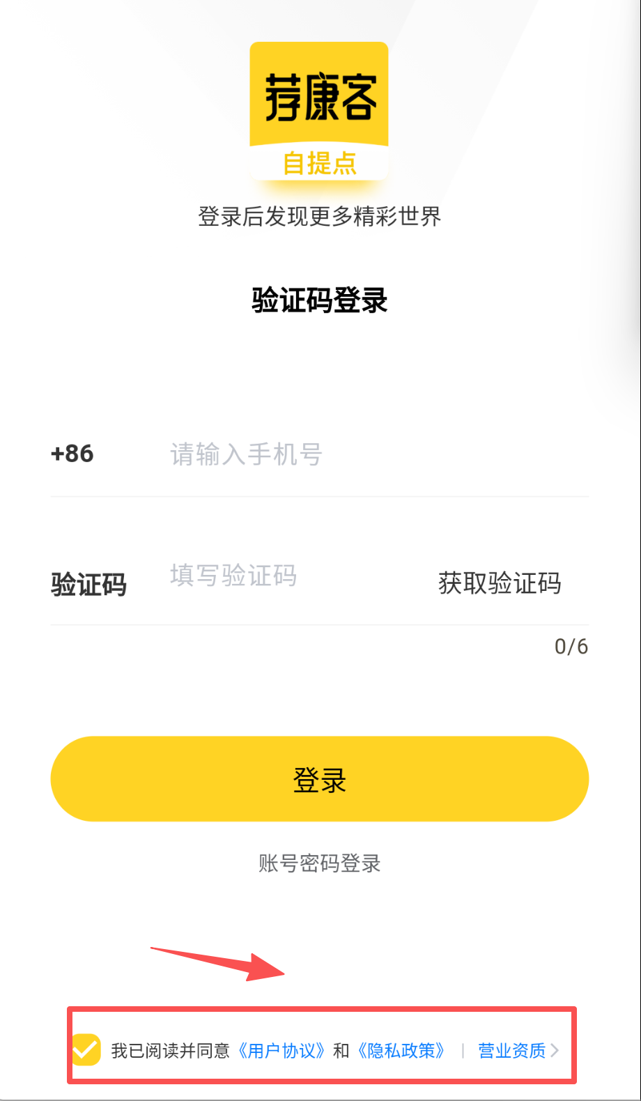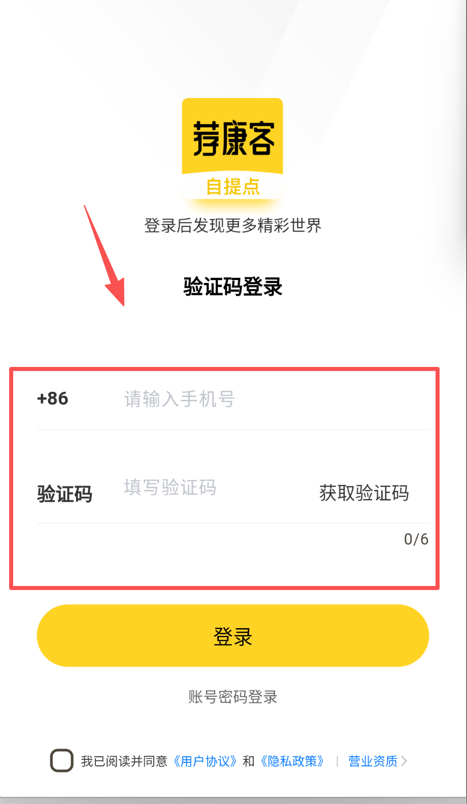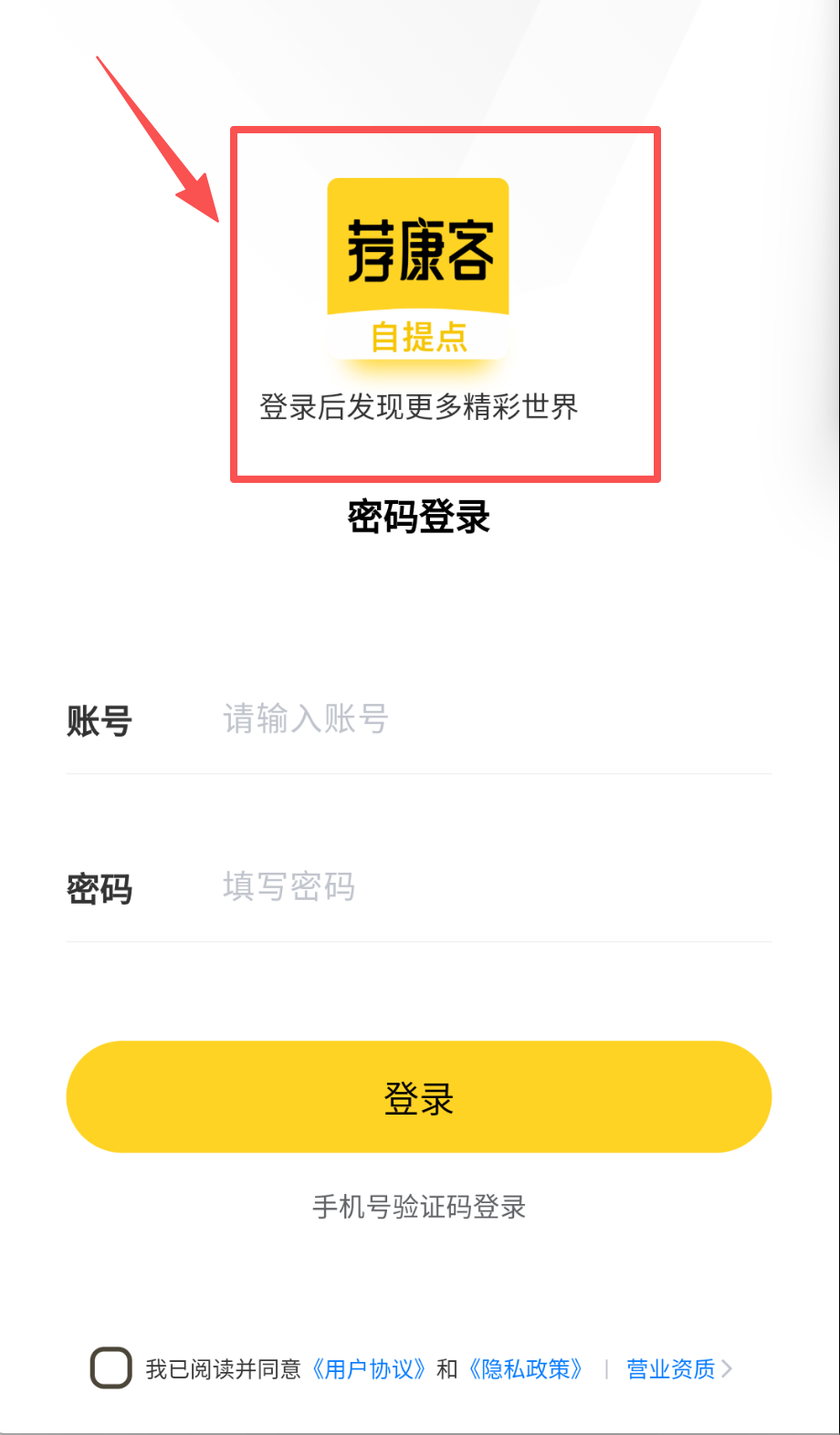 1、 打开荐康客自提点软件呀,首先看到登录界面,上方有醒目的黄色“荐康客 自提点”标志,下方写着“登录后发现更多精彩世界”。
