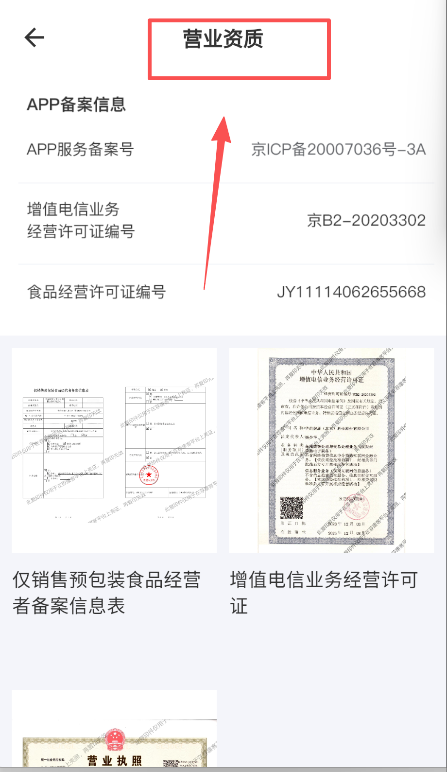 3、 登录成功后,想看看这个软件靠不靠谱,可以点底部菜单的“我的”,在个人中心里找到“营业资质”这一项点进去。