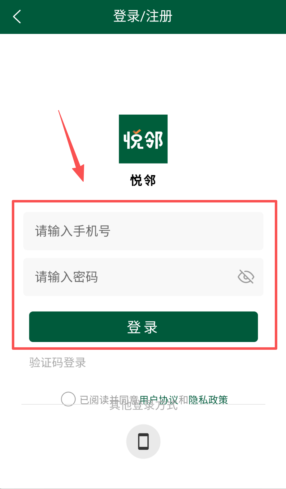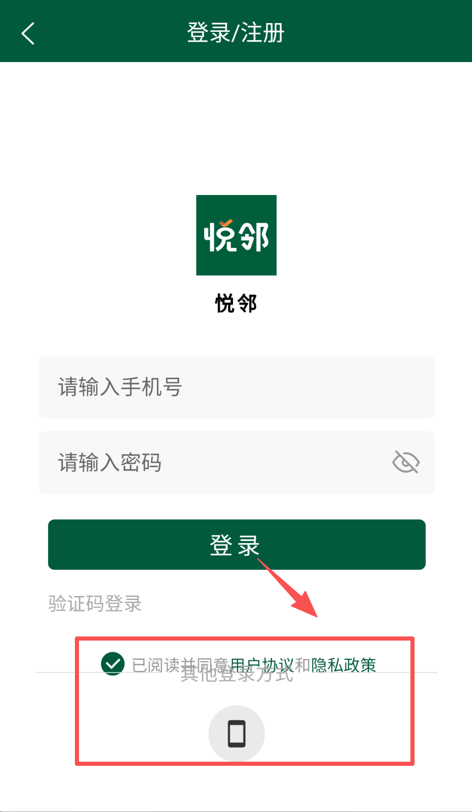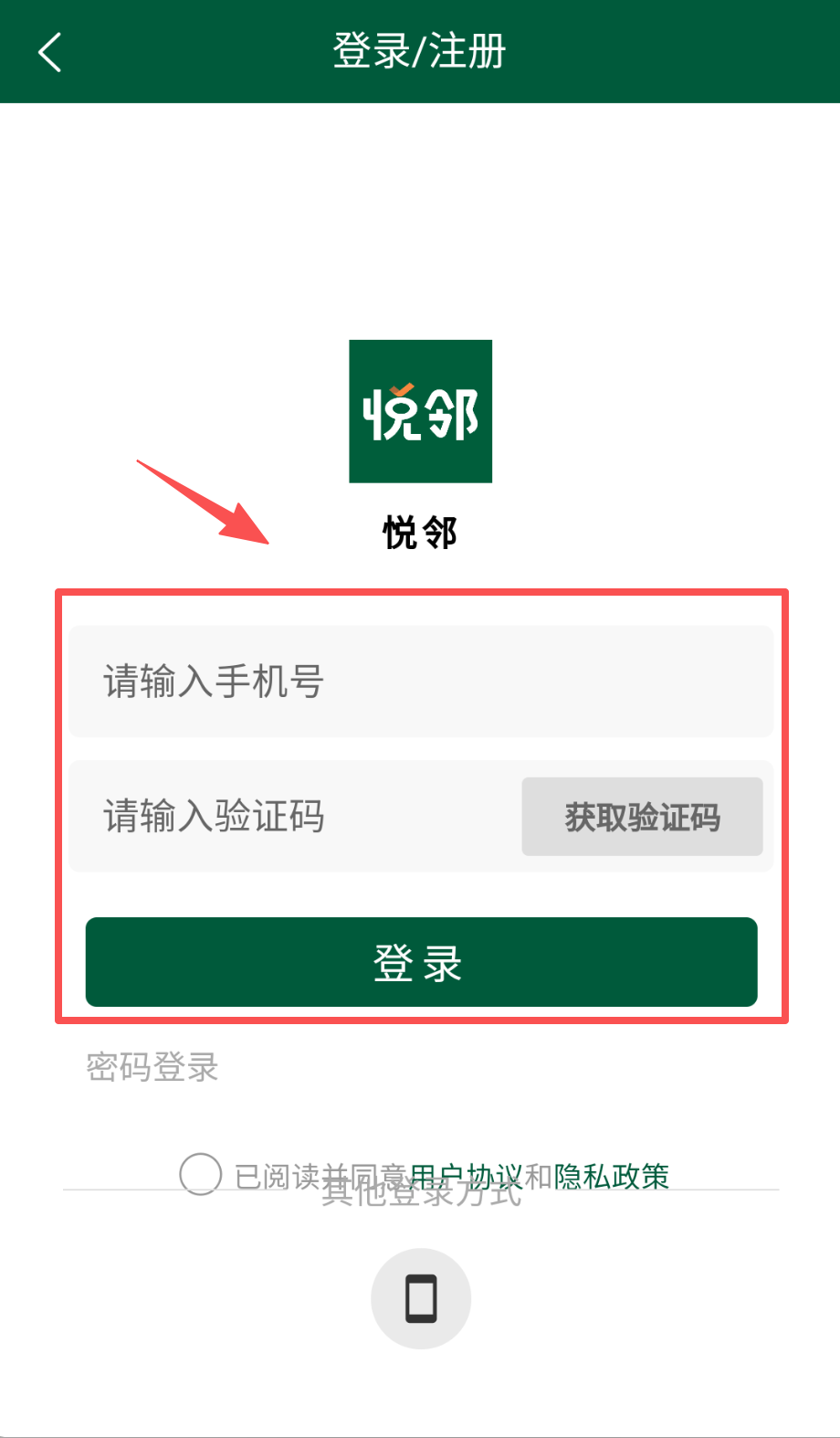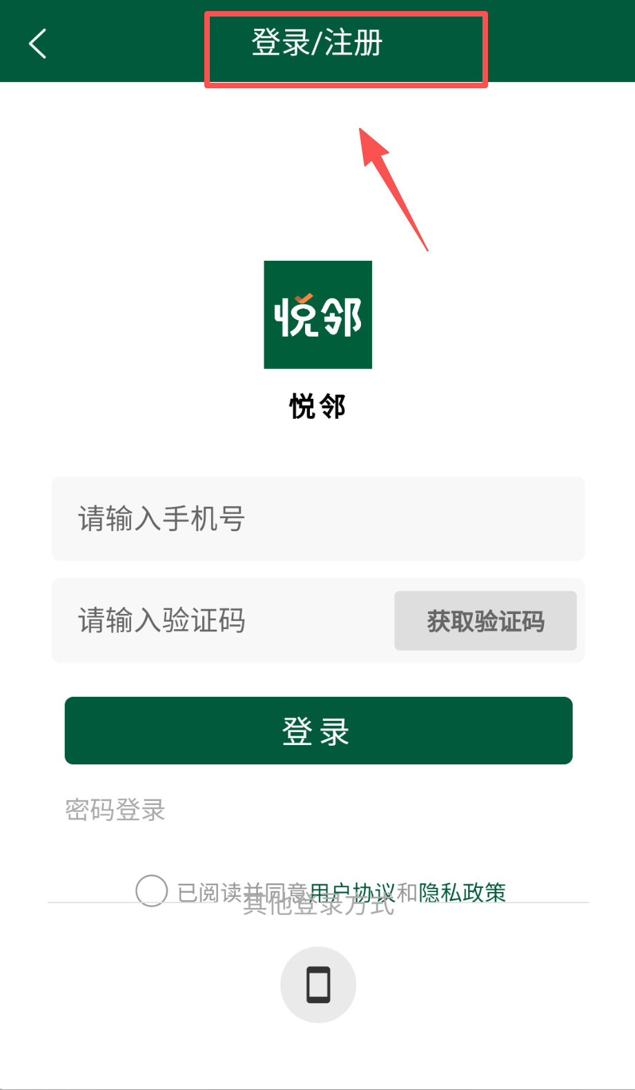 1、 打开悦邻人人播软件呀,首先会看到登录注册页面,页面顶部通常显示着“登录/注册”字样,背景简洁,上方有绿色的“悦邻”标志和名称。
