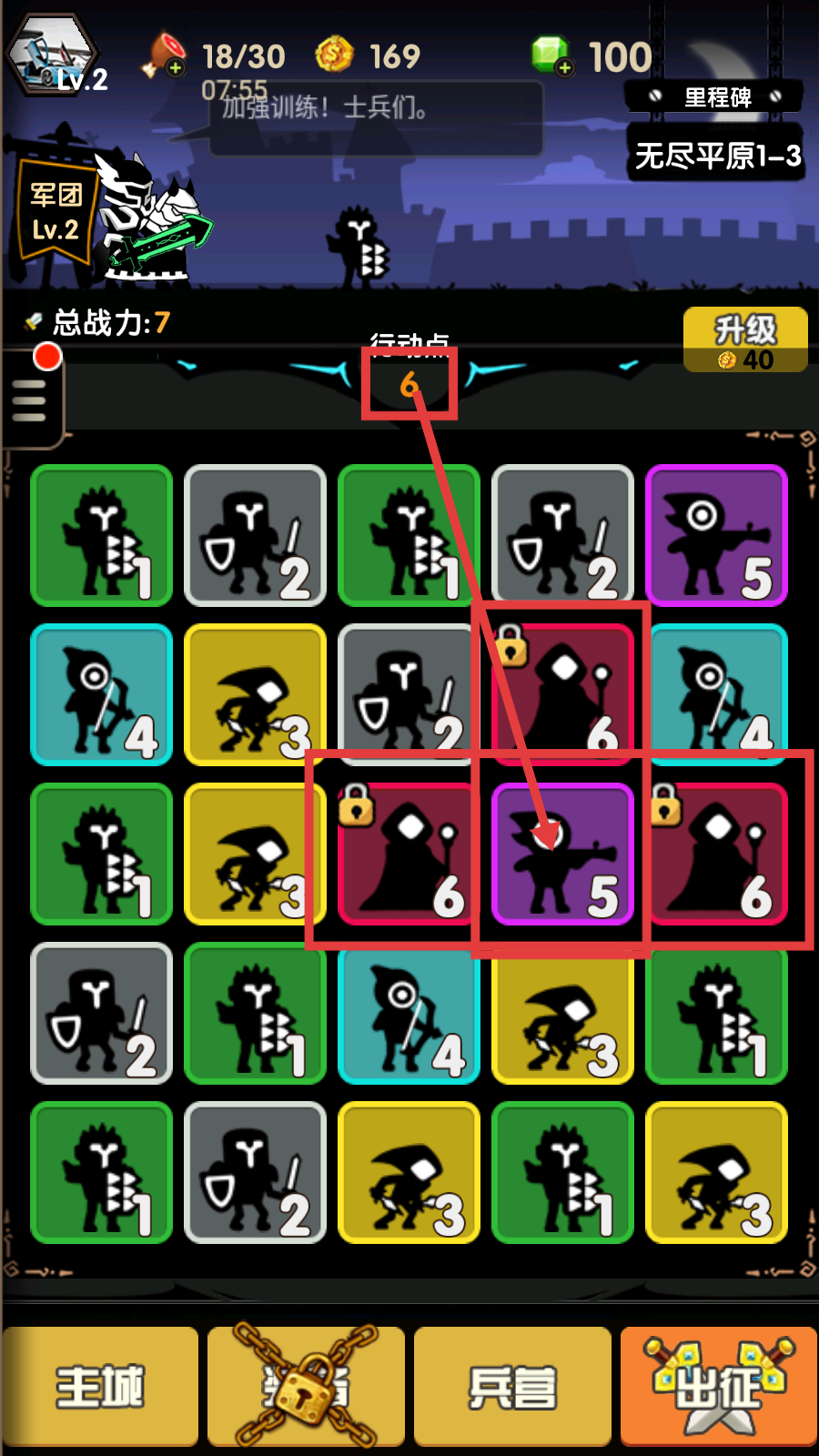 1、战前查看【无尽平原1-3】关卡,根据行动力-6搭配不同战力士兵,合理组合提升总战力准备战斗。