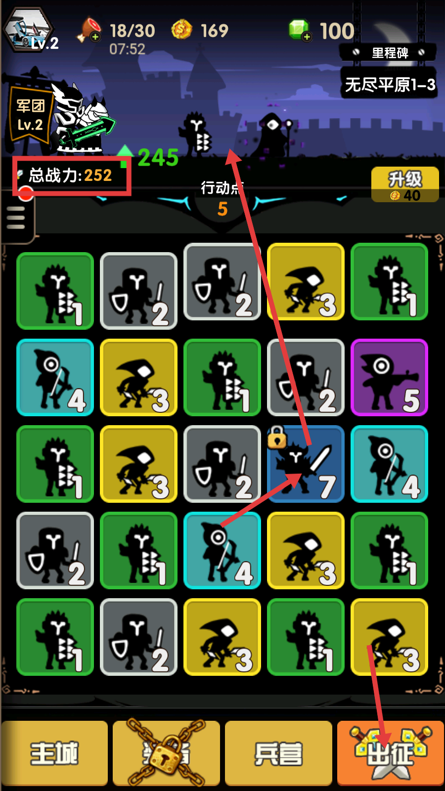 2、士兵搭配好后,总战力提升至252时,点击【出征】按钮,让士兵前往【无尽平原1-3】关卡作战。