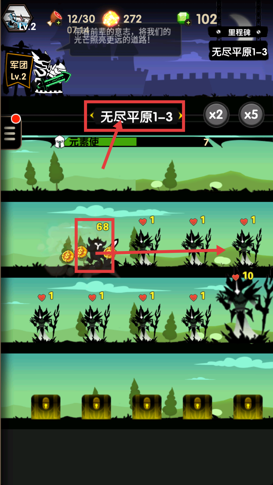3、在【无尽平原1-3】战斗中,操控战力-68的单位推进,依次清理带红心-1的怪物,逐步推进关卡进度。