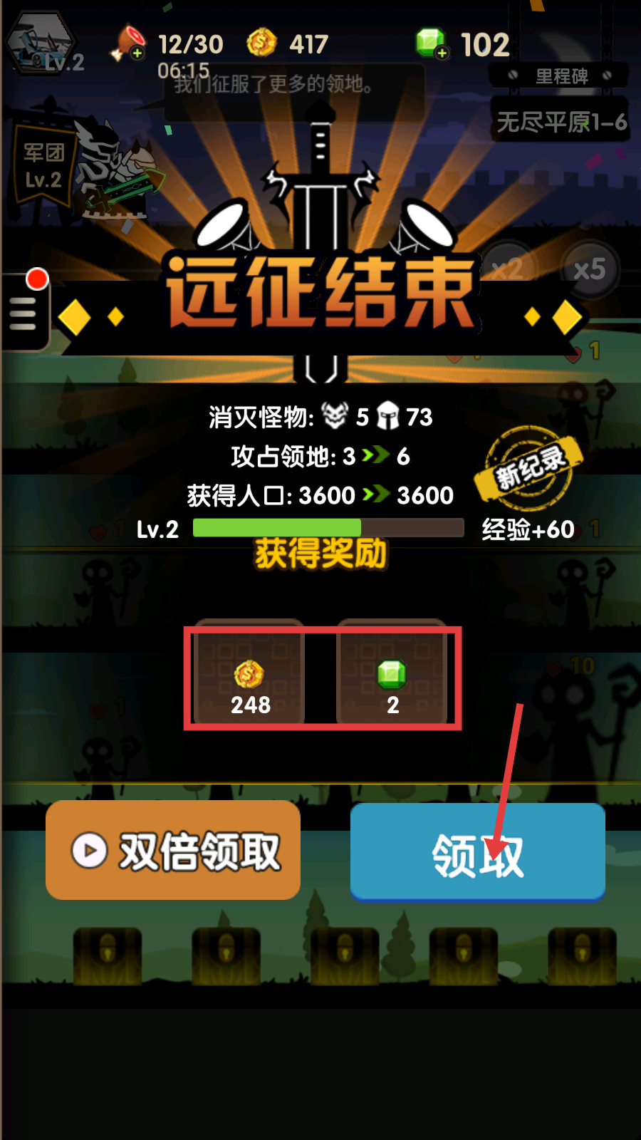 4、完成【无尽平原1-6】远征后,及时点击【领取】按钮,获取金币-248、绿宝石-2等奖励,用于后续升级。