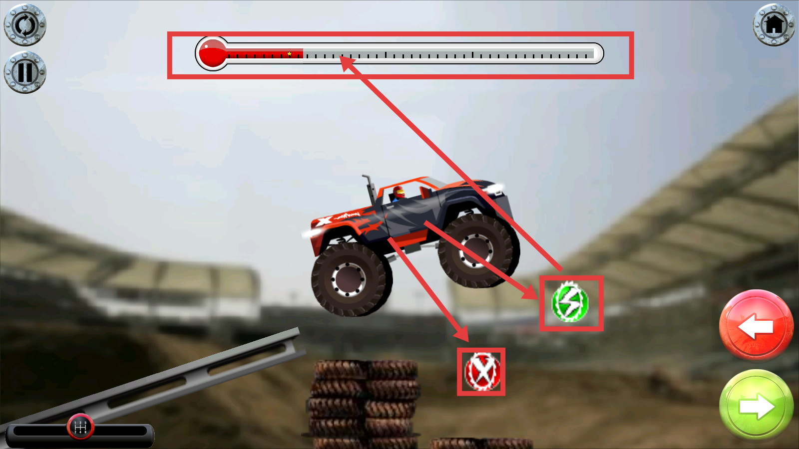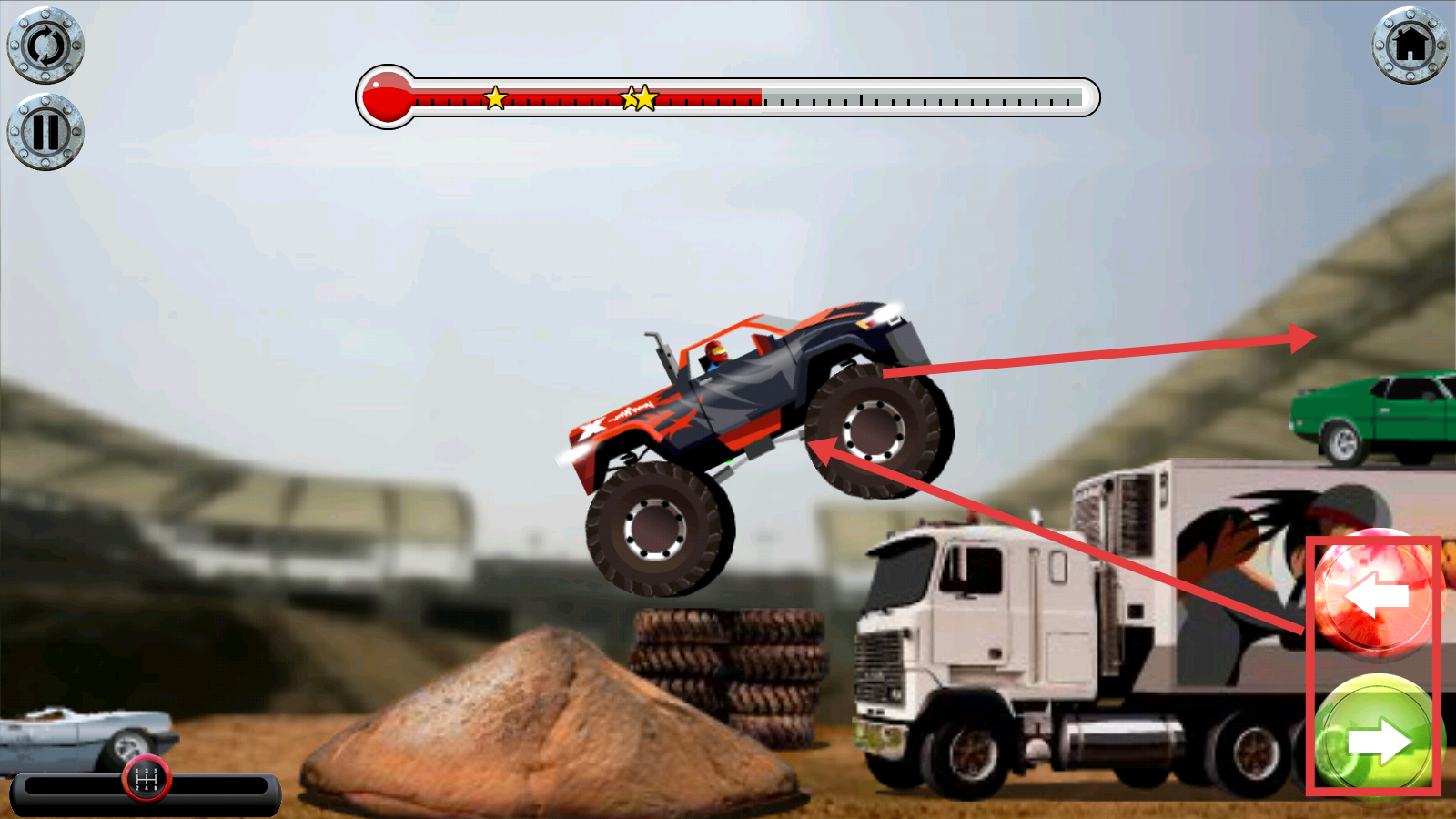 2、在关卡驾驶时,通过右侧红色左箭头、绿色右箭头按钮,操控大脚车的行驶方向,跨越土堆、车辆等障碍。