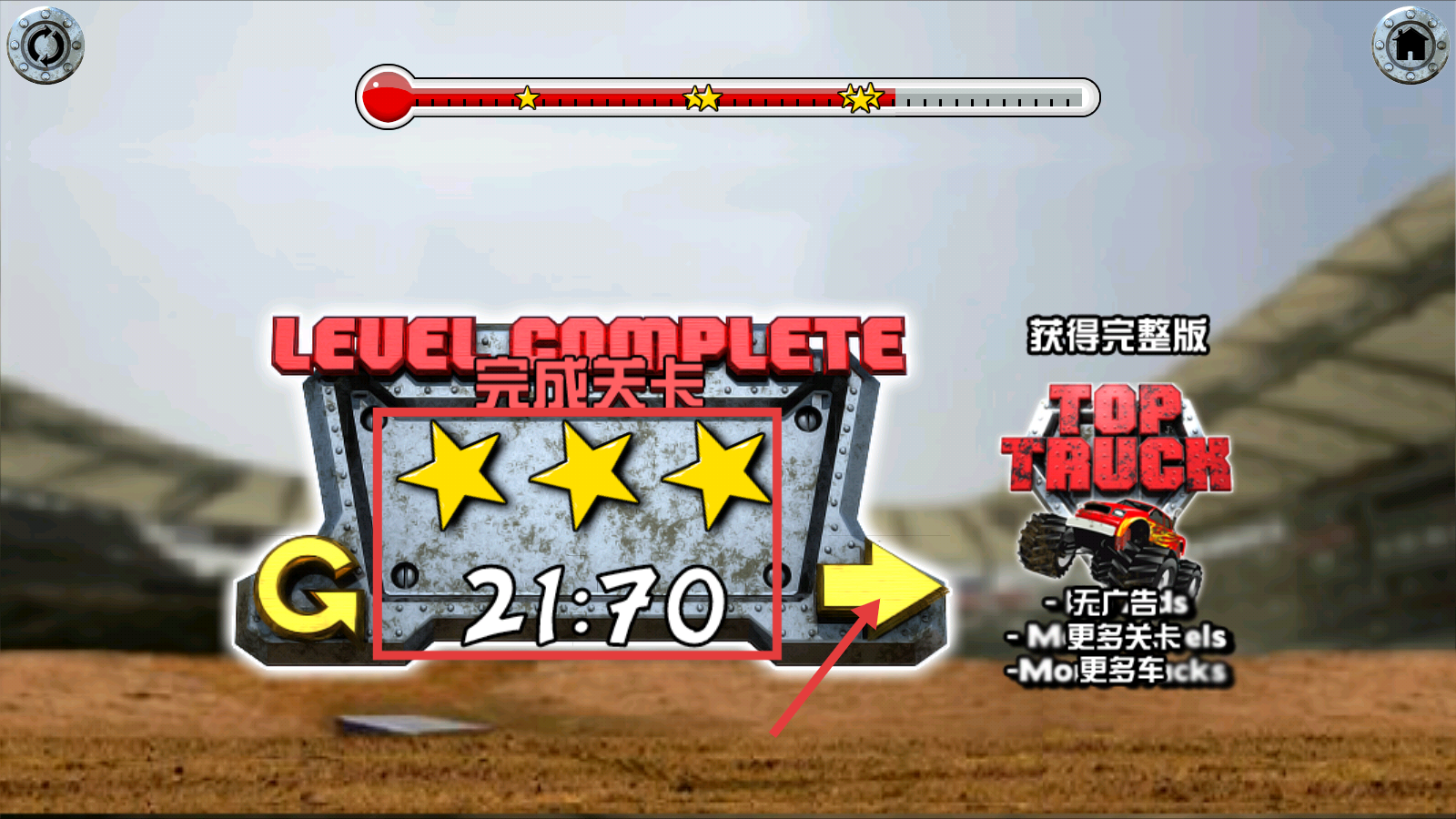 4、当界面显示【LEVELCOMPLETE-完成关卡】时,点击黄色箭头按钮,可继续挑战后续关卡或查看关卡奖励。