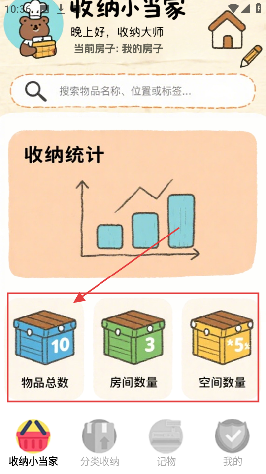 1、在app首页,查看物品总数等收纳统计,了解当前收纳基本情况,为后续收纳做准备。