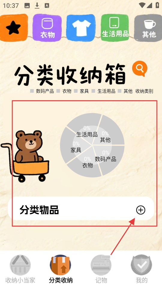 4、到分类收纳页,点分类物品旁【+】号,可添加分类物品,进行分类收纳管理,让物品更有序。