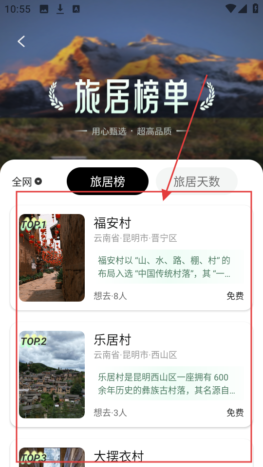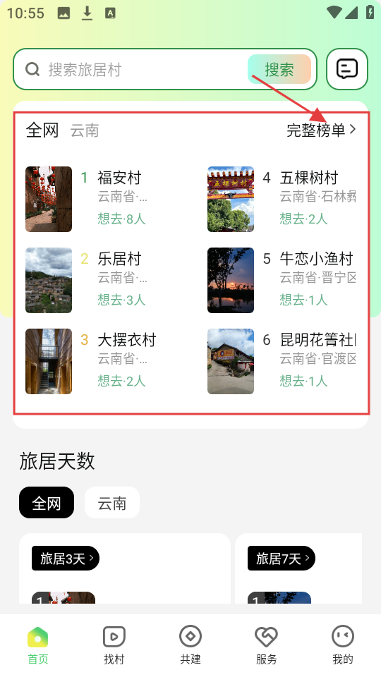 1、在首页,有不同旅居村展示,点【完整榜单】,进入旅居榜单页,查看更多旅居村。