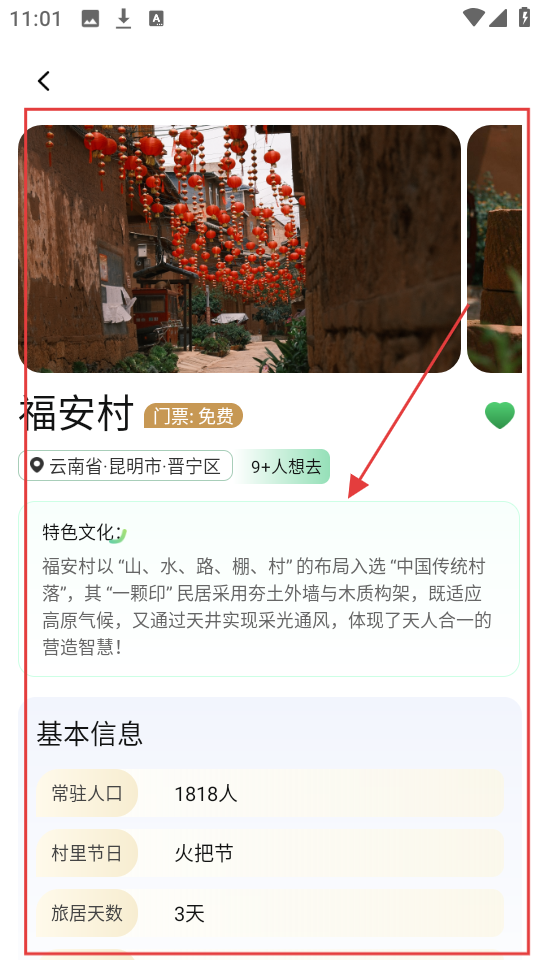 3、在福安村详情页,查看门票、特色文化等信息,了解村子基本情况,为旅居做准备。