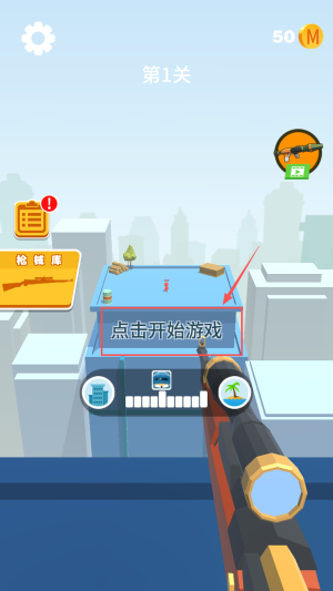 1、如何进入第1关?在主界面点击“枪械库”旁出现的“点击开始游戏”,即可进入第1关。