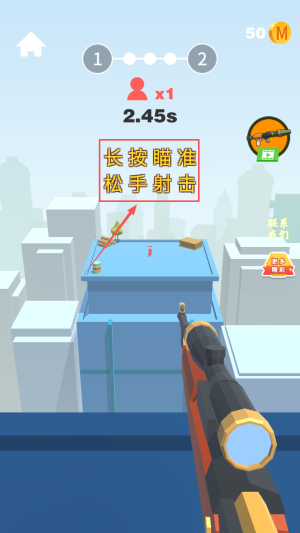 2、如何射击?长按屏幕进入瞄准状态,松手即刻发射子弹,完成2.45秒快速射击。