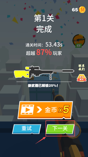 4、如何过关领奖?完成65个目标后弹出“完成”面板,查看“通关时间:53.43s”与奖励“金币x5”,点击“下一关”继续挑战。