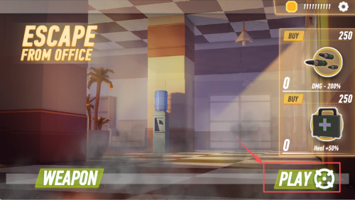 1、如何进入准备商店?开局点击“ESCAPE”模式,用250金币购买“DMG-200%”或“Heal+50%”,再点“WEAPON”选枪,最后按“PLAY”确认。