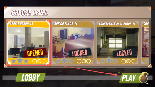 2、如何选择楼层关卡?在“CHOOSE LEVEL”界面点击已解锁的“OFFICE FLOOR 18”或“LOBBY”,星星数越高难度越大,选好后按“PLAY”进入。