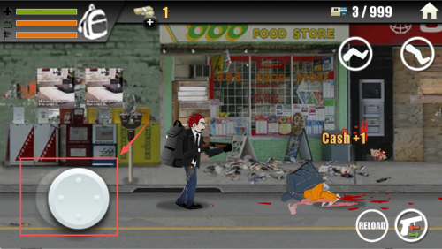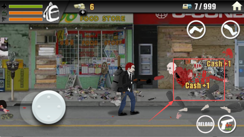 2、横版移动躲攻击:操控角色在横版画面中左右移动,避开僵尸的扑咬,找间隙瞄准射击,别硬扛伤害,保存状态才能应对更多僵尸。