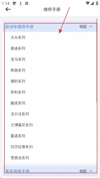 1、在首页,点【维修手册】,进入维修手册页面,可查看不同车系维修手册分类。
