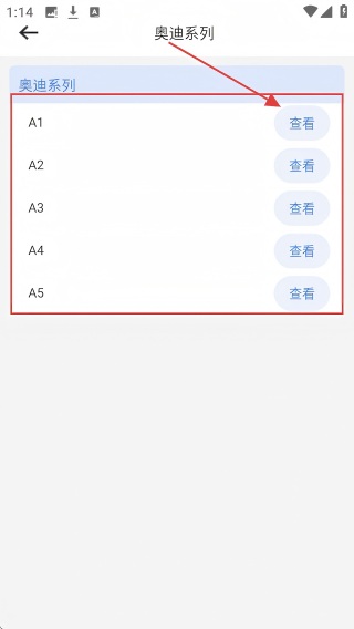 3、在车型列表页,选具体车型,如A1等,点【查看】,可查看对应车型维修详情。