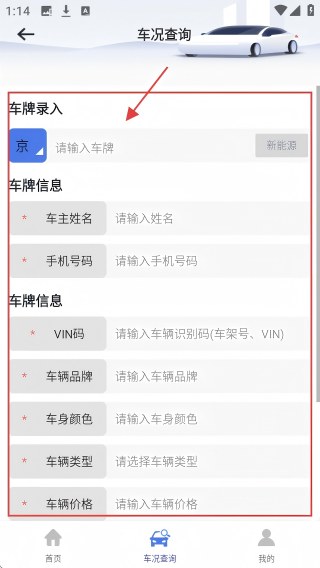 4、到车况查询页,填写车牌、车主姓名等信息,完成录入,可进行车况查询操作。