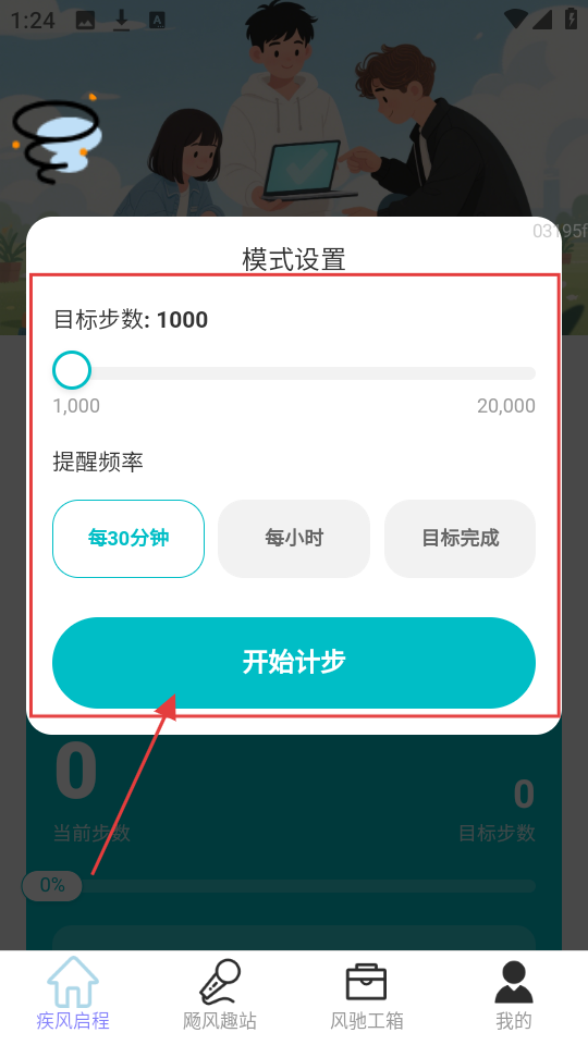 2、在模式设置页面,设置目标步数、提醒频率,点【开始计步】,开启计步功能。