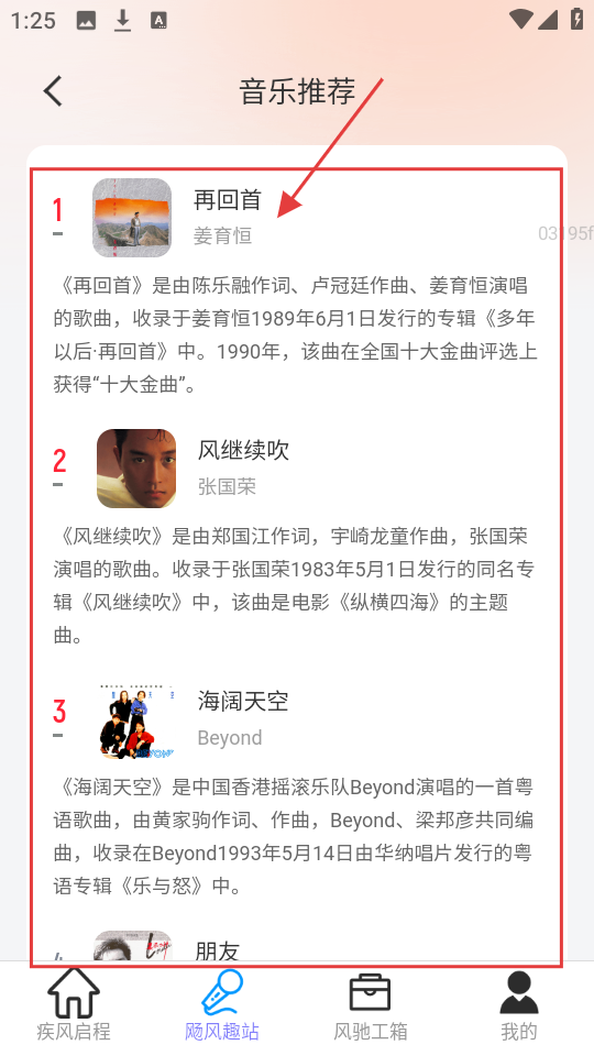 4、在音乐推荐列表页,可查看推荐的音乐,如【再回首】等,了解音乐相关信息。