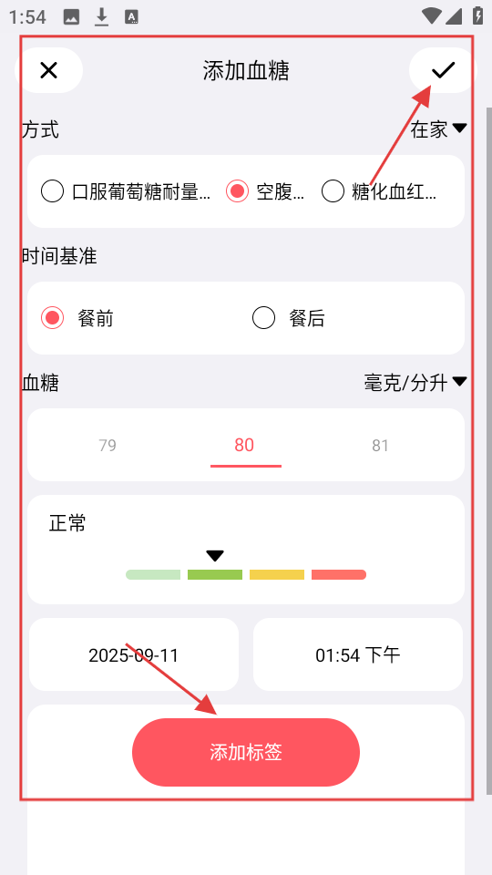 2、在添加血糖页面,选方式、时间基准等,填血糖值,点【添加标签】,完善记录信息。