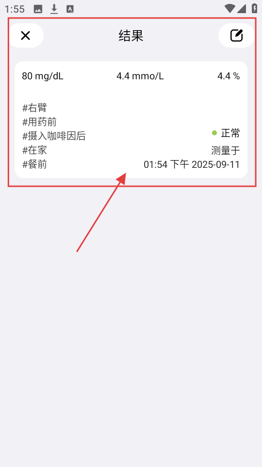 3、完成添加后,进入结果页面,可查看血糖结果,包括数值、标签等详细信息。