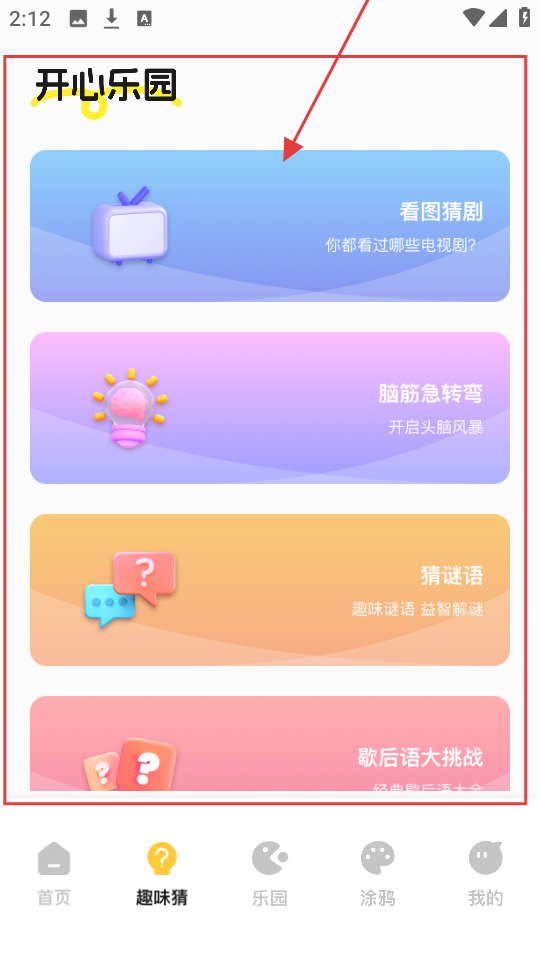 4、到开心乐园页,有看图猜剧等趣味活动,选目标活动,参与可获游戏外乐趣体验。