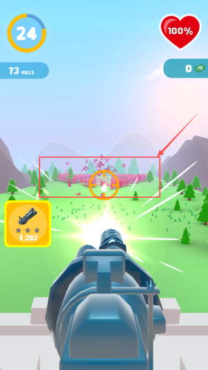 2、如何查看成绩?屏幕中央“73KLS”为当前击杀数,右侧“1202”为得分,星级“★☆★”实时评价。