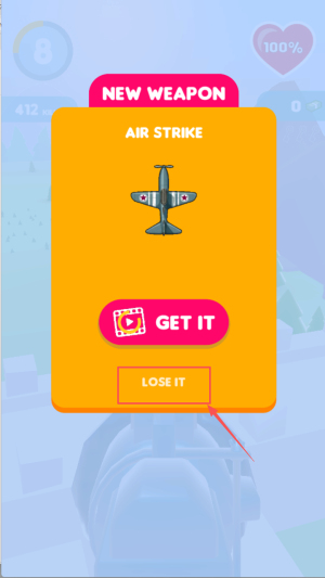 3、如何领取新武器?出现“NEW WEAPON AIRSTRIKE”时,点击“GET IT”立即装备,点“LOSEIT”则放弃。