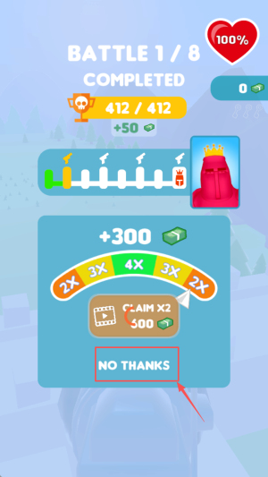 4、如何结算奖励?战斗1/8完成后显示“412/412”满分,点击“+500 +300”领取金币与倍数奖励,点“NO THANKS”跳过。