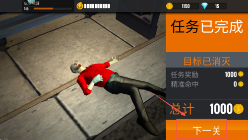4、如何领取奖励?任务完成后显示“目标已消灭”与总计奖励10000,点击“下一关”即可继续挑战。