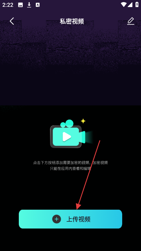 2、在私密视频页面,点【上传视频】,添加需加密的视频,加密后仅能在应用内查看编辑。