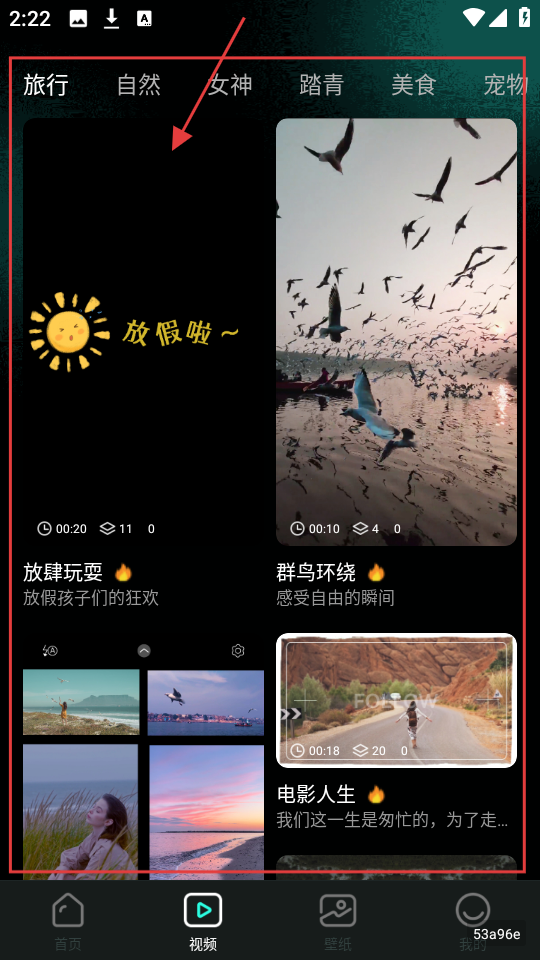3、到视频页,有旅行等分类视频,选目标视频,如群鸟环绕,进入视频详情页。