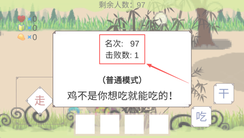 4、如何查看结果?比赛结束显示“名次:97 击败数:1”,系统提醒“鸡不是你想吃就能吃的!”,点击“吃”返回大厅。