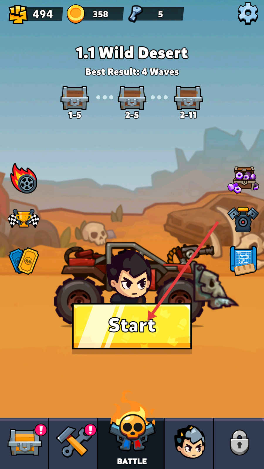 1、点击【Start】进入【1.1-Wild-Desert】关卡,查看当前拥有的金币-358、钥匙-5等资源,为战斗做准备。